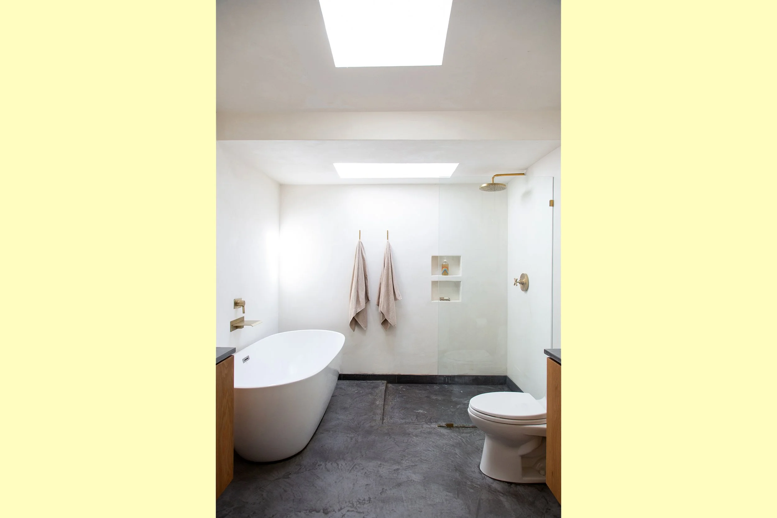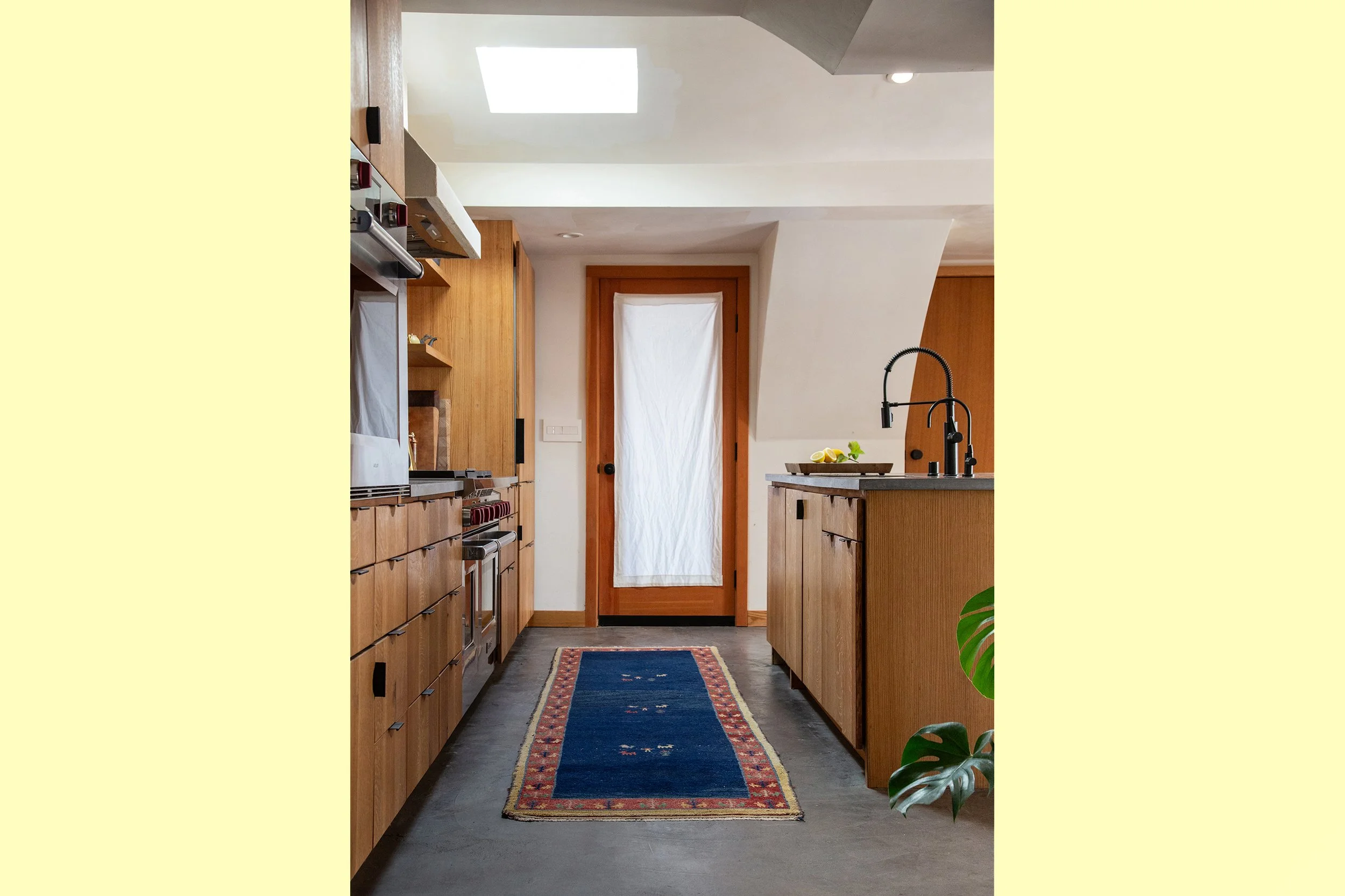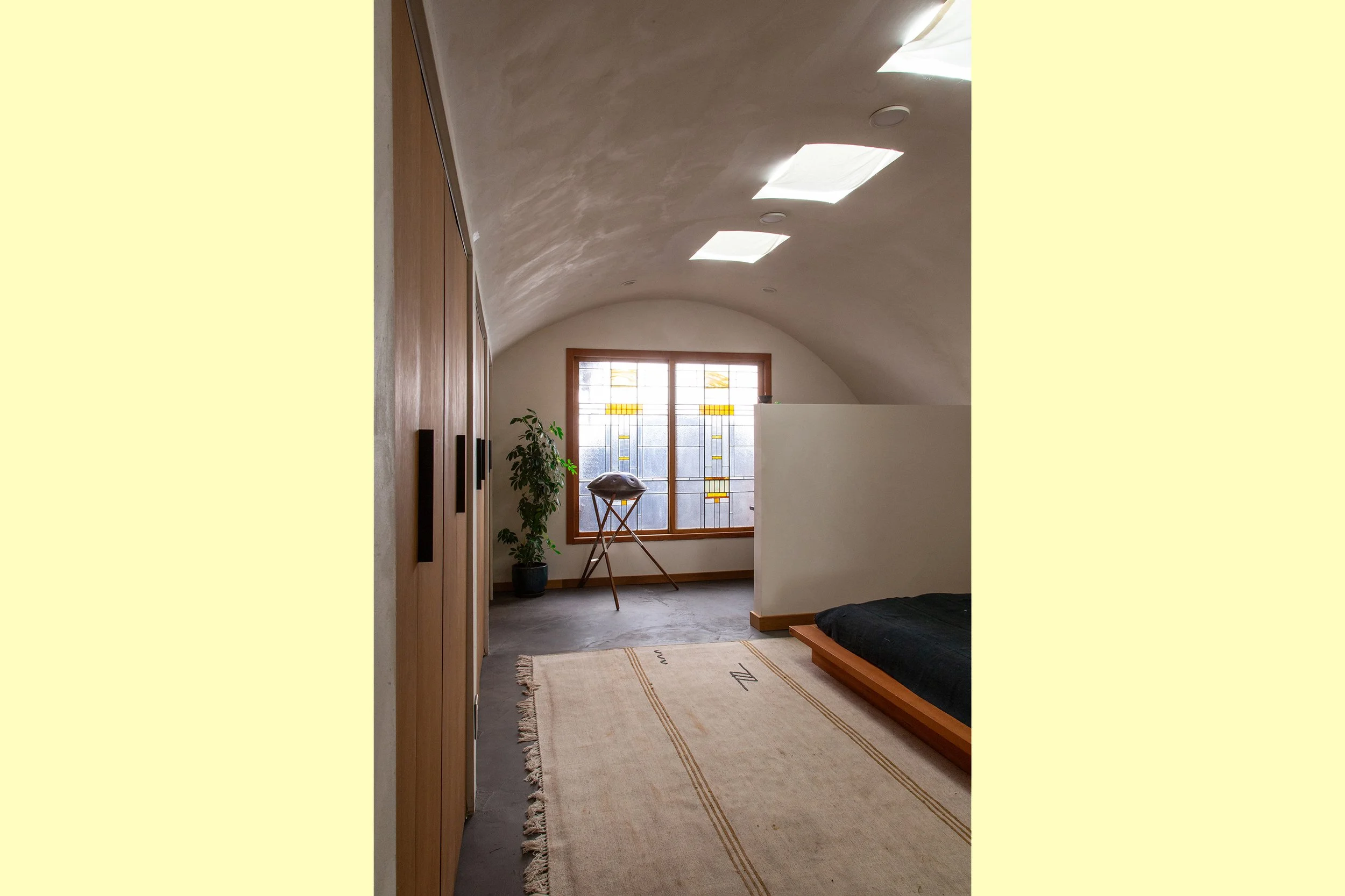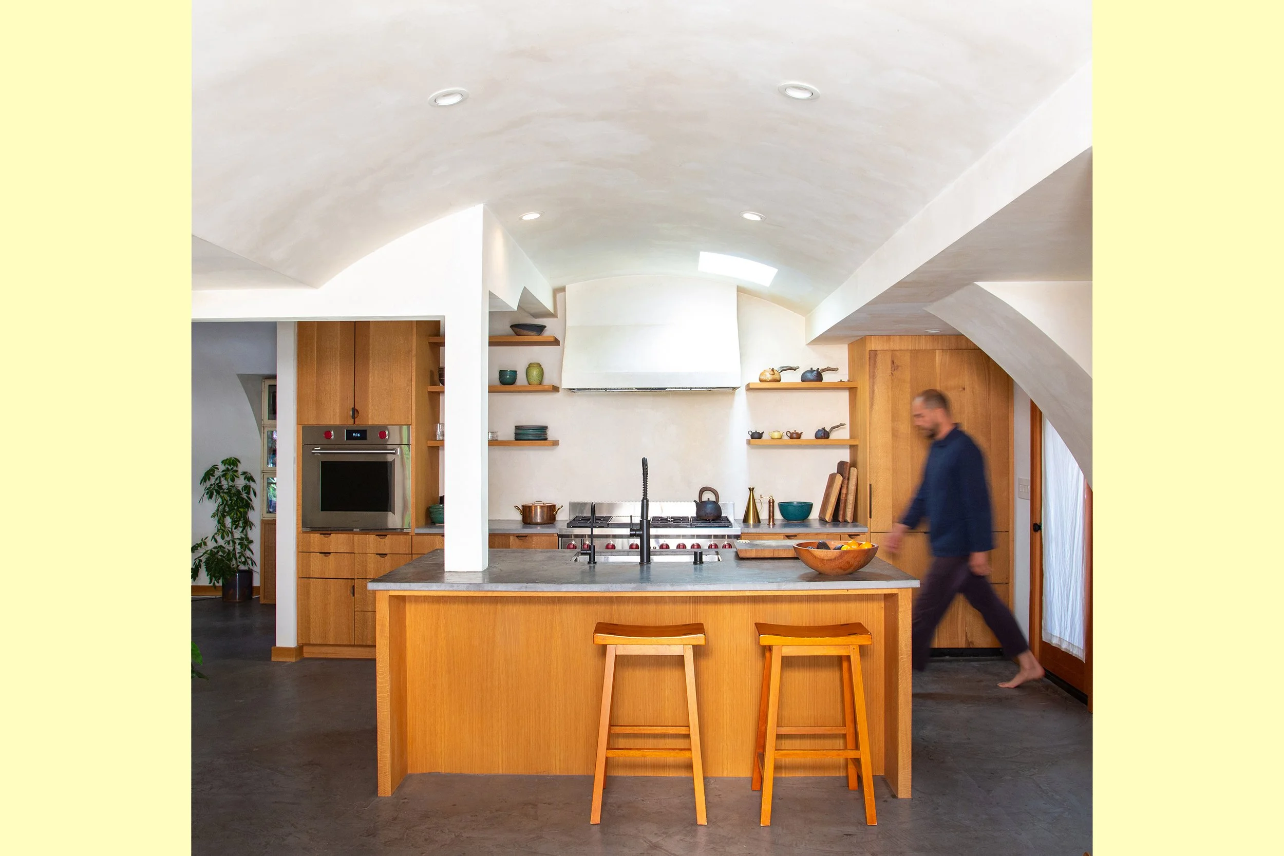 The home’s history stems from the post-war 1940’s, when it was amassed from three different repurposed military Quonset huts. While efficient and enduring, the home lacked continuity and comfort. MIST Architects, in collaboration with the client as builder, reconfigured and reimagined the space’s possibilities within the existing footprint to create a natural, connected, and purposeful home complete with the client’s own artistic detailing. Smooth, rounded plaster ceilings glorify the Quonset form, while warm natural wood and cool site-poured concrete tones bring harmony to this valley oasis. Skylights were placed strategically, walls were removed for more open flow, and modern yet tactile materials were chosen to balance the collaboration’s artistic light with the peaceful country surroundings. Built entirely by the client, this dream collaboration between artist and architect yielded a truly one-of-a-kind home that fits perfectly within the unique nature of Ojai.
